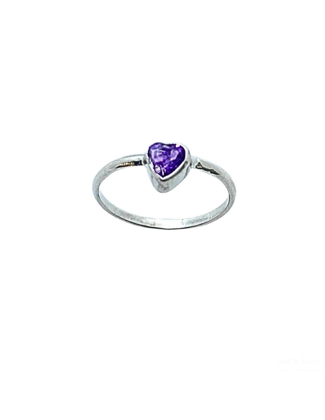 Bague artisanale en argent rhodié garnie d'une véritable pierre fine d'améthyste taillée en forme de coeur. Pierre de 5mm et anneau en fil d'argent de 1,5mm de large, tour de doigt 57.