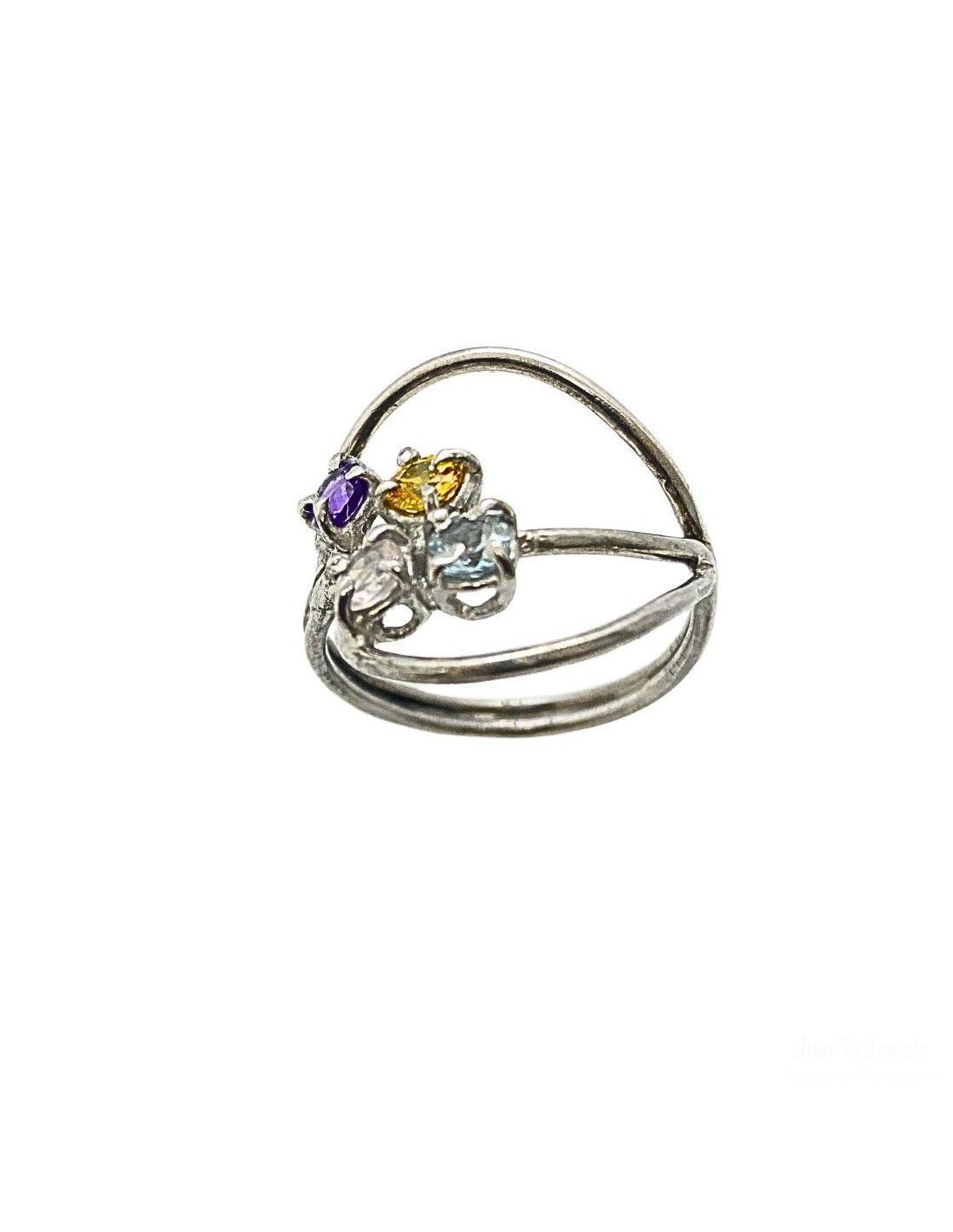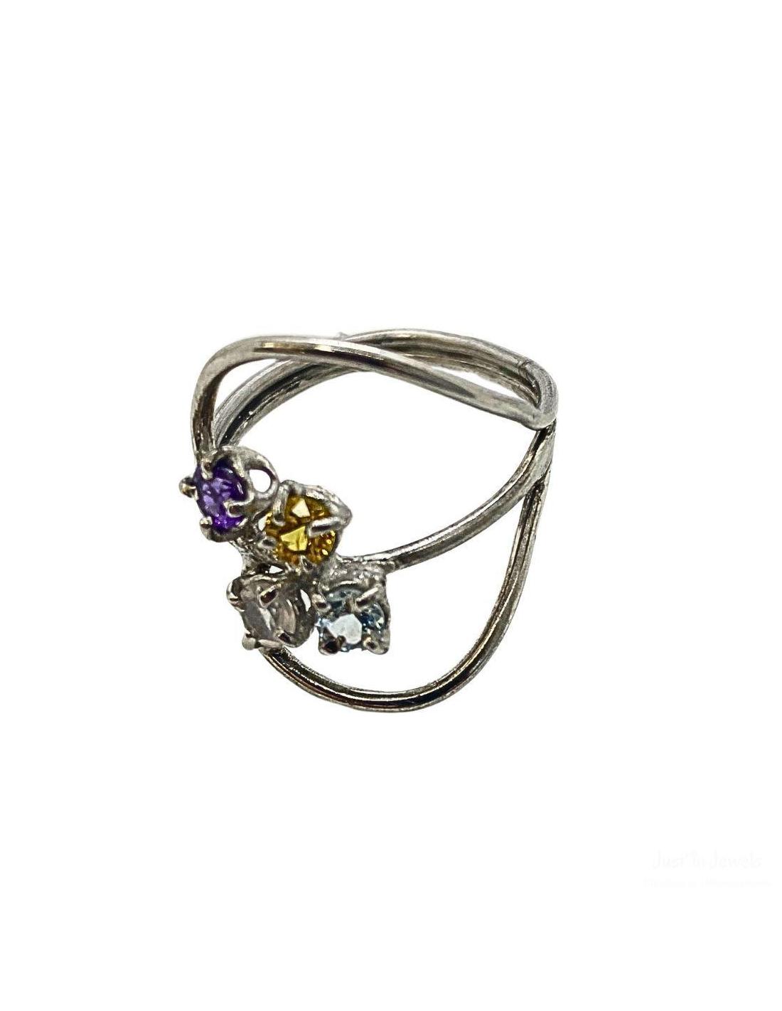 Bague artisanale en argent rhodié antiallergique proposant une combinaison de 4 pierres une aigue marine bleu ciel, un quartz rose d'un rose pâle, une améthyste violette et une citrine jaune.
