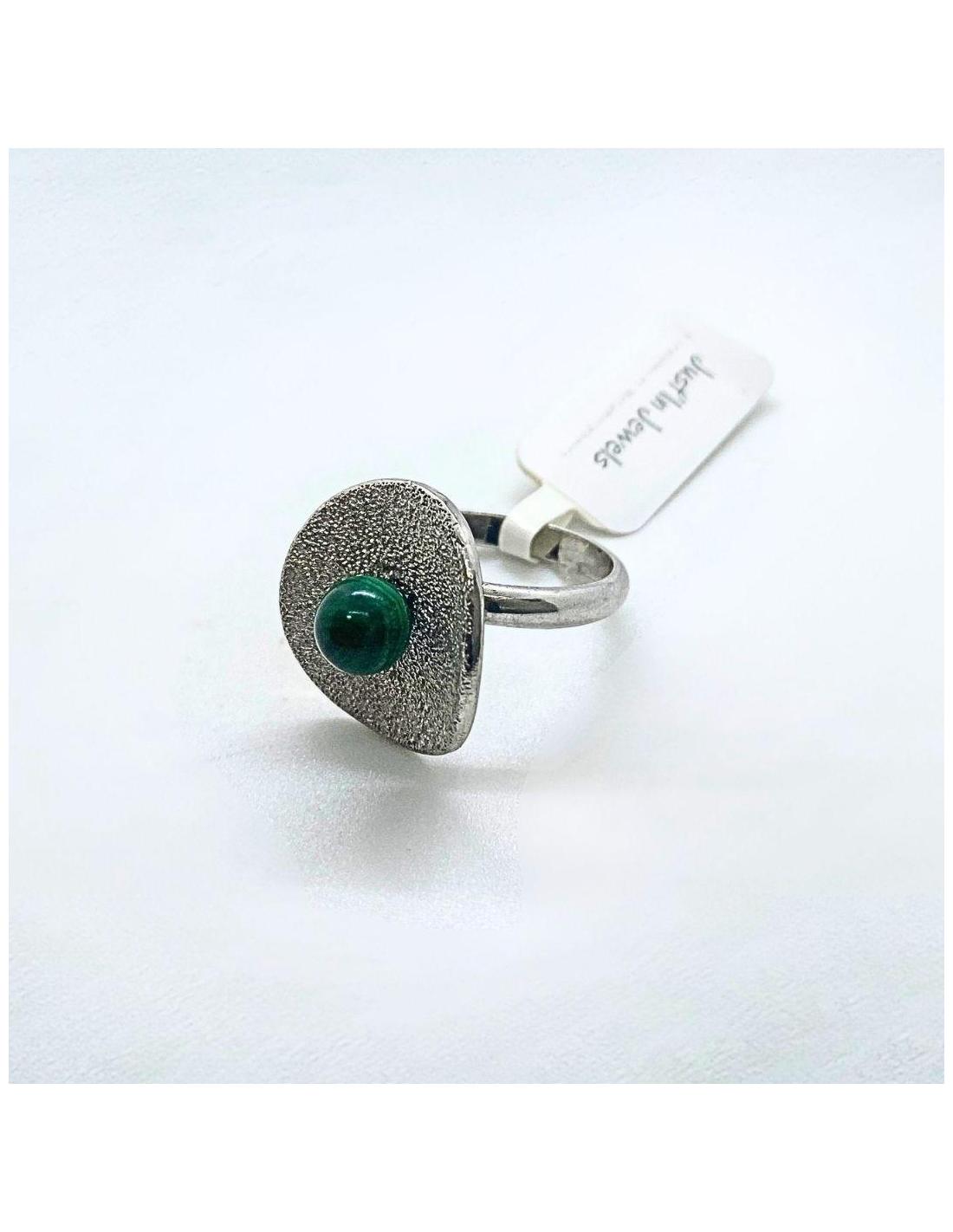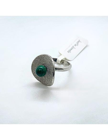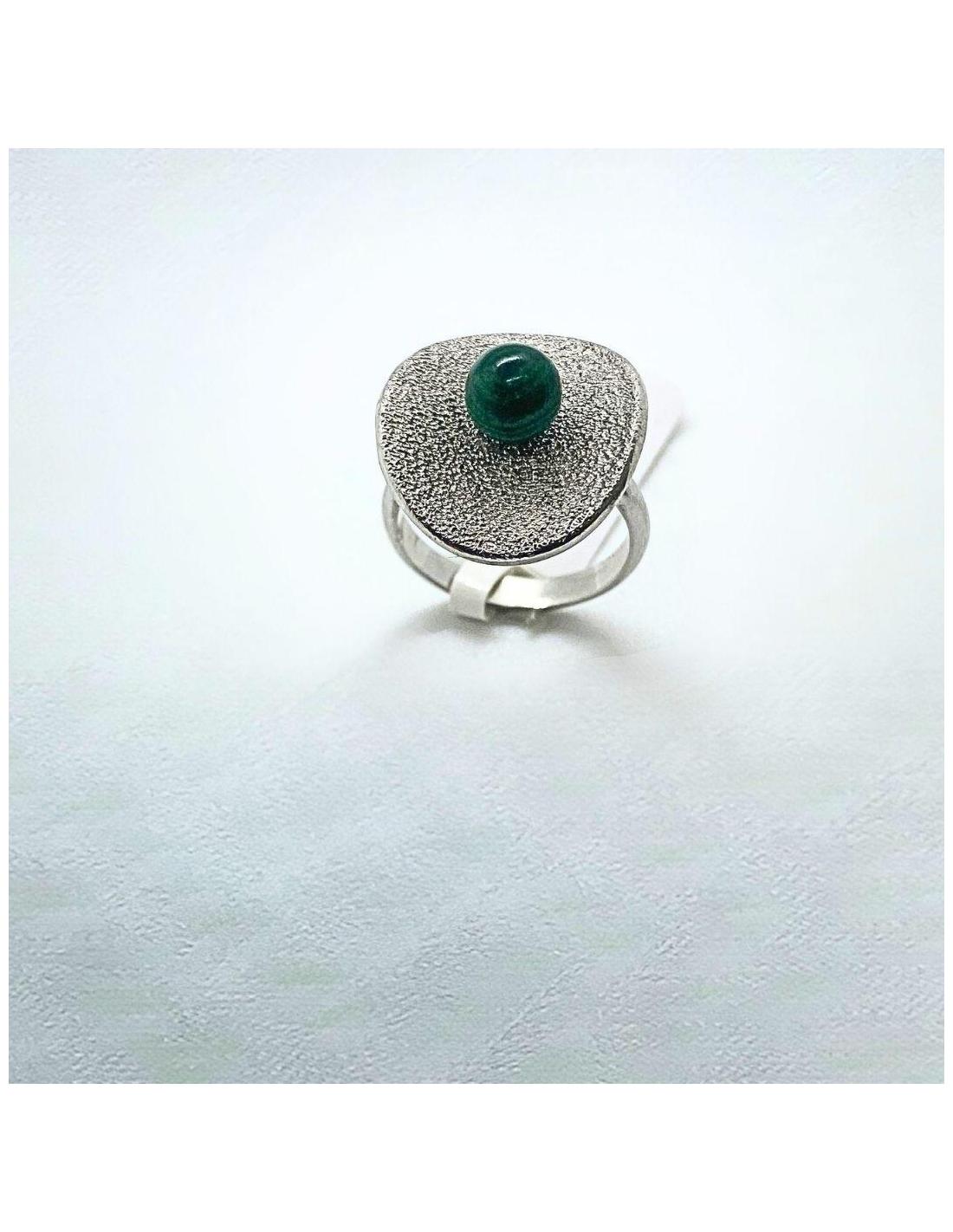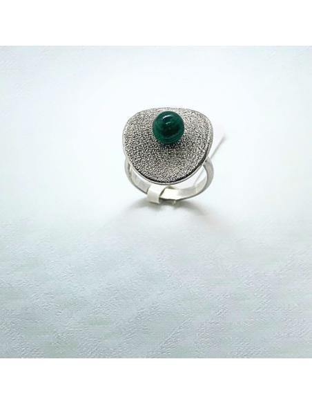 Bague femme artisanale en argent rhodié et antiallergique, dans l'onde de cette bague taille 53 est fixée également une perle de véritable malachite. Cette perle de 6mm expose son mystérieux vert et propose un superbe contraste avec l'effet diamanté de la surface intérieure de cette bague.