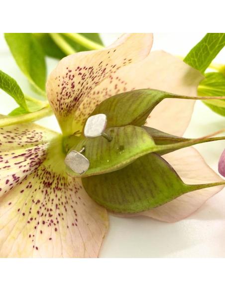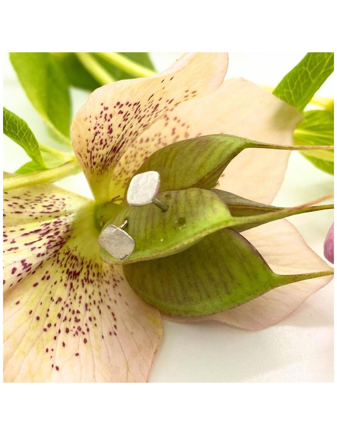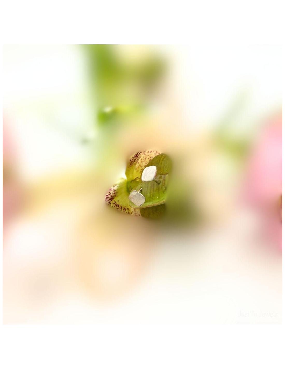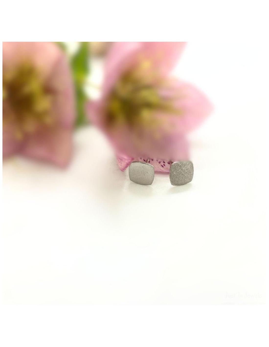 Puce d'oreille, système perceuse, une forme géométrique carrée de 5mm avec un délicat effet de surface satiné et rhodiée