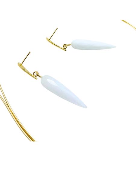 Dans nos créations réalisées dans notre atelier bijouterie artisanale de Ramillies, nous n'utilisons que des pierres fines naturelles, ici du cachalong en forme de pendule et facetté qui propose un superbe contraste avec la couleur or de la partie en argent vermeil.