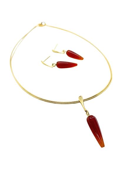 Boucle d'oreille en argent plaqué or vermeil, sous le motif argent en forme de goutte, se balance une goutte de cornaline, striée, en forme de pendule (30mm de haut).