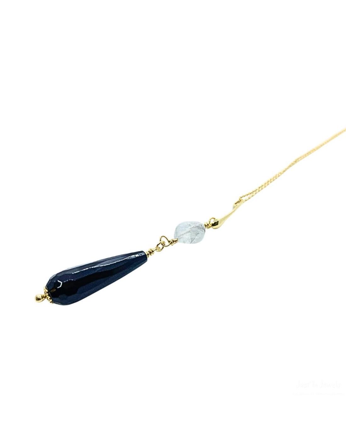 Collier argent plaqué or vermeil, tour de cou de 42cm avec un pendentif proposant une goutte facettée d'agate noire sous un losange de quartz gris.