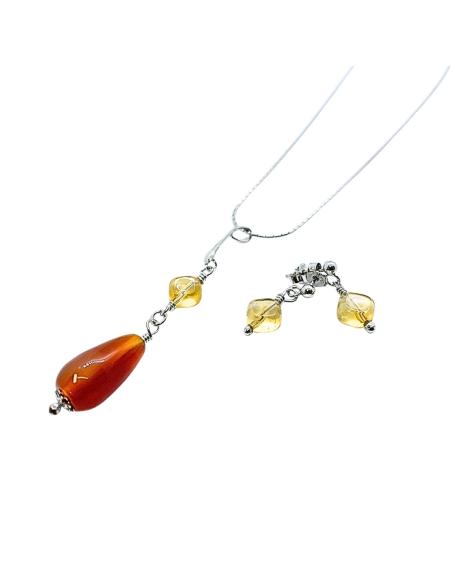 Collier argent plaqué or vermeil, tour de cou de 42cm avec un pendentif proposant une goutte lisse de cornaline sous un losange de citrine.