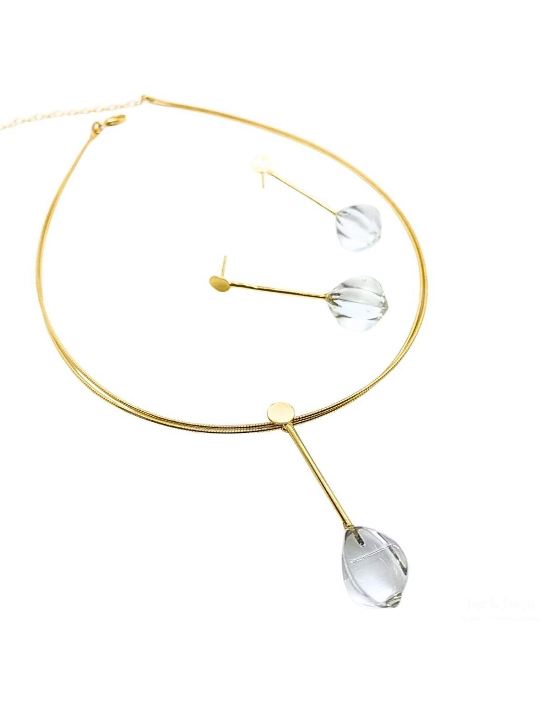 Collier artisanal en argent plaqué or vermeil, tour de cou double chaine omega sur laquelle est suspendu un pendentif en argent constitué d'un disque prolongé d'un tube s'insérant dans un véritable cristal de roche facetté 4 faces. Forme de la pierre très originale et rarement proposée.