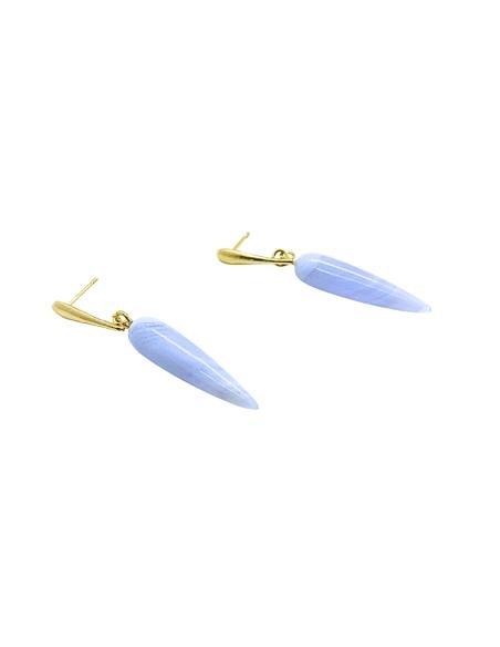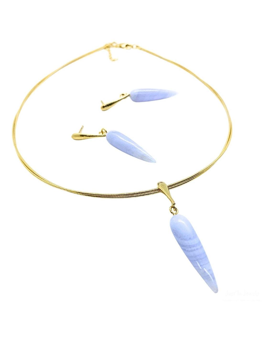 Collier artisanal en argent plaqué or vermeil, tour de cou double chaine omega sur laquelle est suspendu un pendentif en argent constitué d'une goutte argent vermeil et d'un pendule de calcédoine bleue, un ciel d'été à votre cou . Forme de la pierre très originale. Une magnifique combinaison de couleur entre l'or du collier et le bleu ciel de la véritable calcédoine.